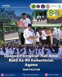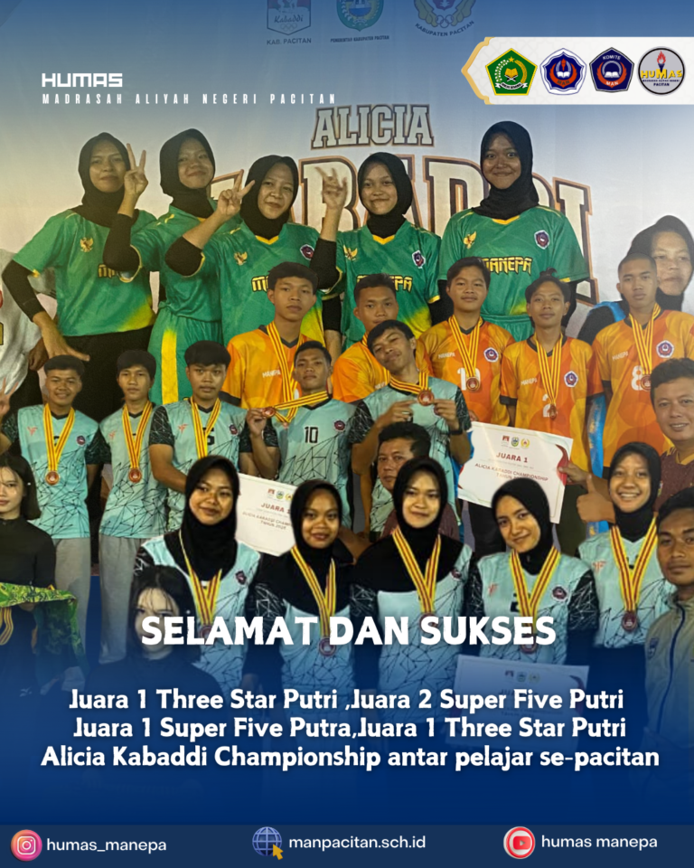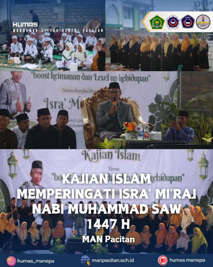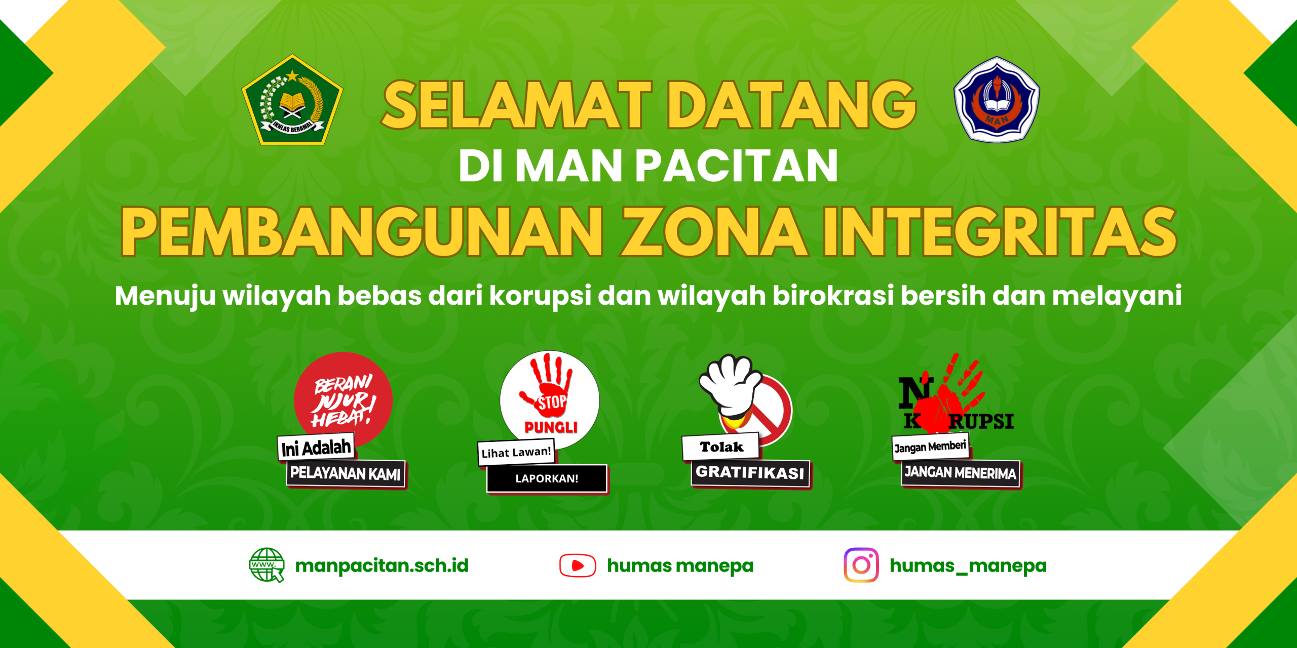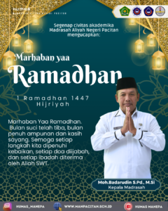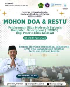 Assalamu’alaikum warahmatullahi wabarakatuh. Puji syukur ke hadirat Allah SWT atas rahmat dan hidayah-Nya. Madrasah Aliyah Negeri Pacitan terus berupaya mencetak generasi berilmu, berakhlak mulia, dan berdaya saing. Sebagai lembaga berlandaskan nilai Islam, MAN Pacitan berkomitmen memberikan pendidikan berkualitas yang menyeimbangkan ilmu dan karakter. Terima kasih atas dukungan semua pihak. Semoga ikhtiar kita menjadi amal jariyah dalam mencerdaskan bangsa. Wassalamu’alaikum warahmatullahi wabarakatuh. Moh. Badarudin, S.Pd., M.Si. Kepala MAN Pacitan
