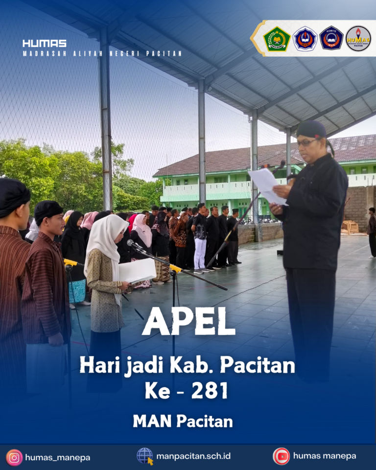 Assalamu’alaikum warahmatullahi wabarakatuh. Puji syukur ke hadirat Allah SWT atas rahmat dan hidayah-Nya. Madrasah Aliyah Negeri Pacitan terus berupaya mencetak generasi berilmu, berakhlak mulia, dan berdaya saing. Sebagai lembaga berlandaskan nilai Islam, MAN Pacitan berkomitmen memberikan pendidikan berkualitas yang menyeimbangkan ilmu dan karakter. Terima kasih atas dukungan semua pihak. Semoga ikhtiar kita menjadi amal jariyah dalam mencerdaskan bangsa. Wassalamu’alaikum warahmatullahi wabarakatuh. Moh. Badarudin, S.Pd., M.Si. Kepala MAN Pacitan