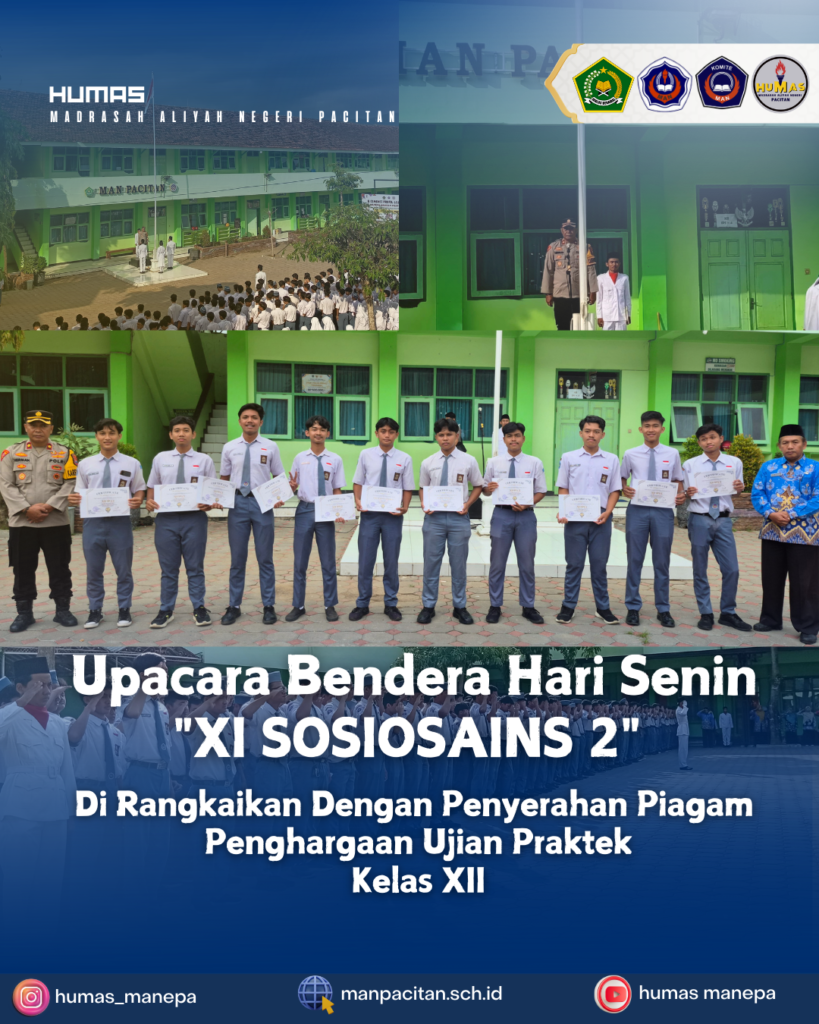Upacara Bendera Hari Senin Kelas XI Sosiosains 2 Dirangkaikan dengan Penyerahan Piagam Penghargaan Ujian Praktik Kelas XIIPacitan — Madrasah Aliyah Negeri Pacitan kembali melaksanakan upacara bendera rutin hari Senin yang diikuti oleh seluruh siswa, guru, serta tenaga kependidikan di halaman madrasah. Pada kesempatan ini, petugas upacara dipercayakan kepada kelas XI Sosiosains 2 yang melaksanakan tugas […]