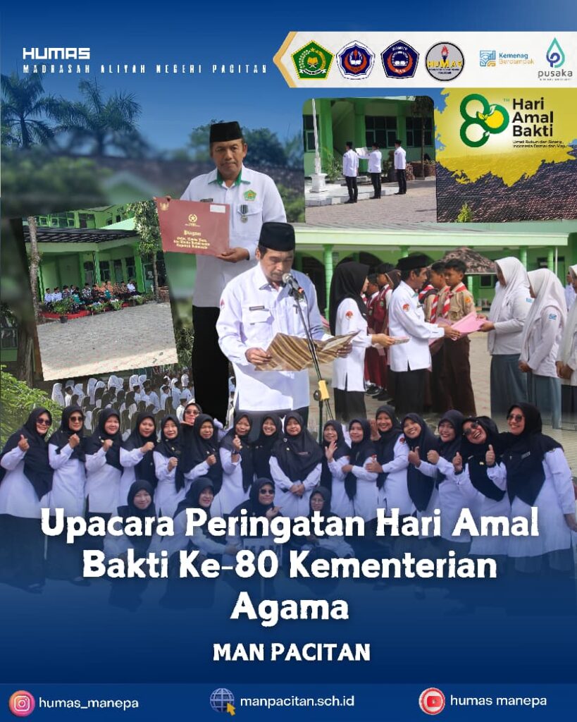Pacitan — Madrasah Aliyah Negeri (MAN) Pacitan melaksanakan upacara peringatan Hari Amal Bakti (HAB) ke-80 Kementerian Agama Republik Indonesia pada hari ini dengan khidmat. Peringatan HAB ke-80 tahun ini mengusung tema “Umat Rukun dan Sinergi, Indonesia Damai dan Maju.” Upacara yang digelar di halaman MAN Pacitan tersebut diikuti oleh kepala madrasah, dewan guru, tenaga kependidikan, […]